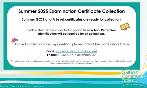 If you are unable to collect your certificates or have any questions, the Examinations Office is available to help. You can contact the team via email at smclelland@saltashcloud.net or by phone on 01752 843715 (extension 263).